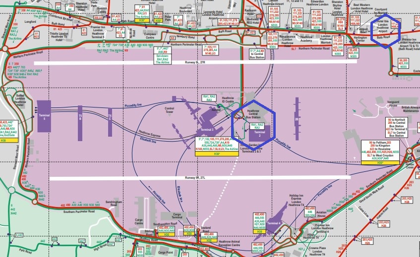 Local red bus routes 105,111,140 ibis Styles Hotel to Heathrow Airport