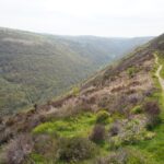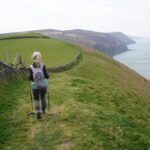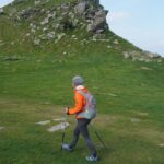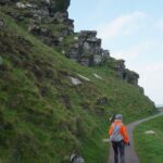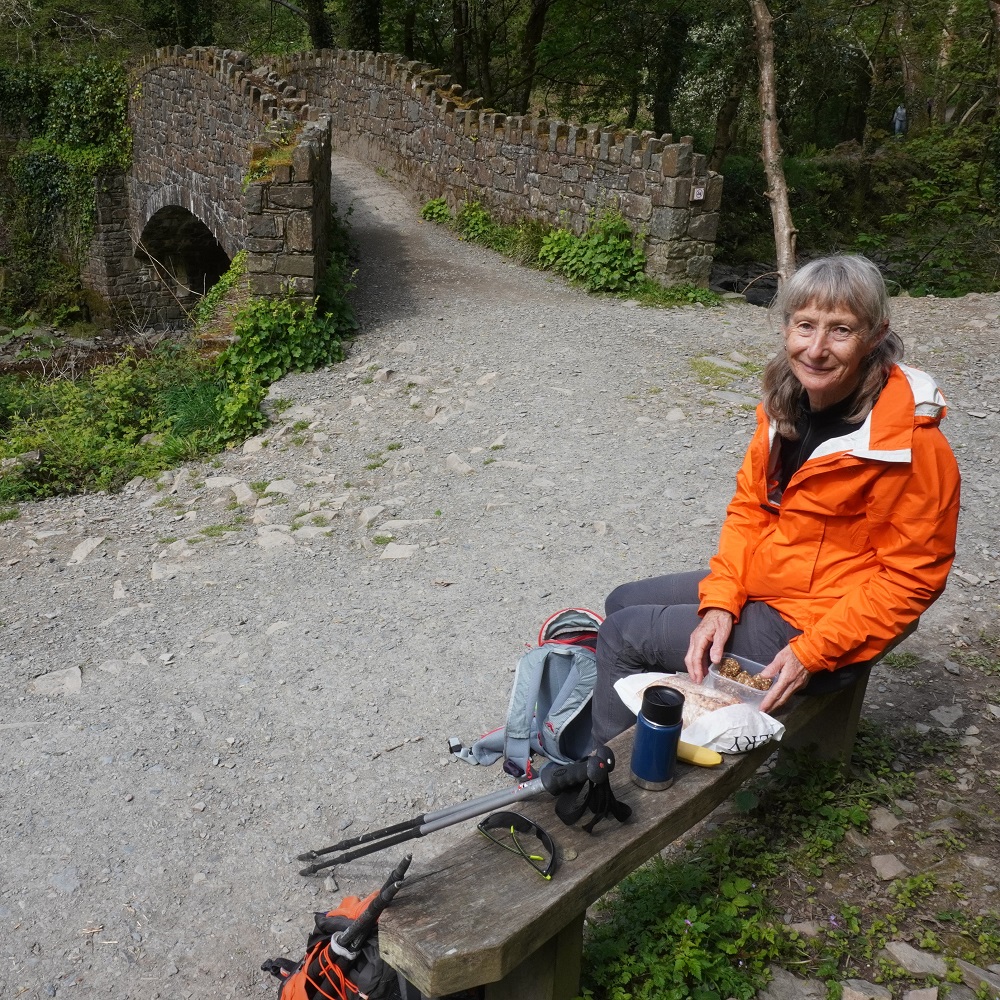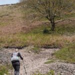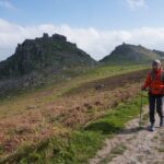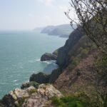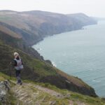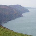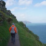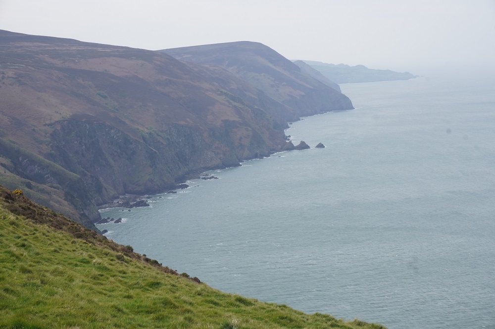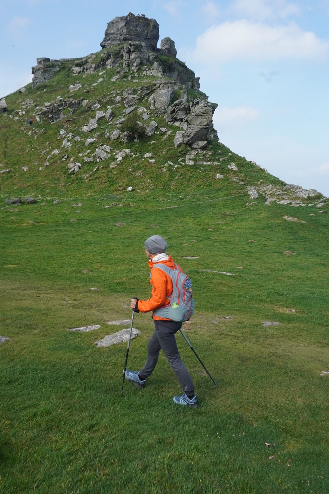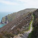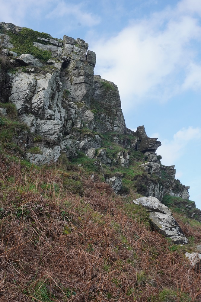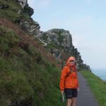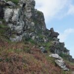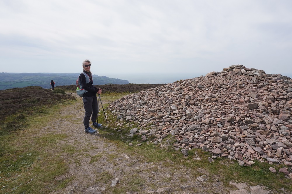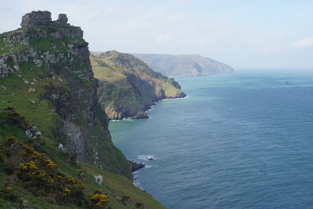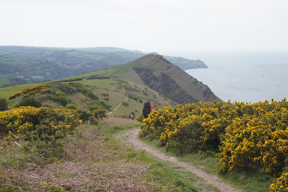 There were some spectacular coastal landscapes today, starting with the Valley of the Rocks. This is a group of peculiarly weathered rock formations formed by the last Ice Age and unlike any others in the South West. Most combes run at right angles to the sea but this runs parallel to the coast. The formations have names like Devil’s Cheesewring, Ragged Jack, Castle Rock. People have lived here since the iron and bronze ages but today the inhabitants are Exmoor ponies and feral goats. After some woodland walking at Woody Bay the next challenge was Heddon’s Mouth. This is a large valley and one of the steepest in England. There is a long diagonal walk down the side of the valley to a little stone arch bridge to cross the River Heddon. Then a very steep zig zag path on loose scree and many steps that are too tall to take comfortably. It seems to take forever to get back up to the tops again. The final challenge was Great Hangman, the highest point on the entire SWCP at 318m. Great Hangman does not look spectacular, it is a large very rounded hill, just a bit higher than other hills. Hence the climb is not steep. It just goes on for a long time. At the top there are good views inland over Exmoor and up and down the coast. There is also a large pile of stones. Maybe we were supposed to bring a stone from home to put on the pile, and to think of home and our loved ones. This is the sort of thing they are into on the Camino. A bit further on is Little Hangman, a much more dramatic looking peak, but only 218m high.
