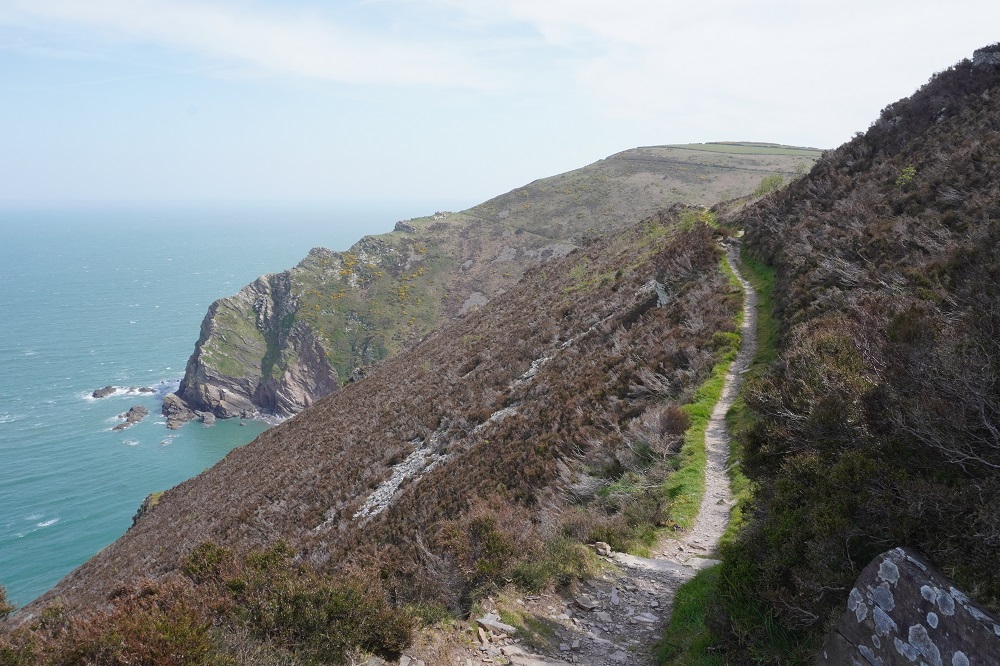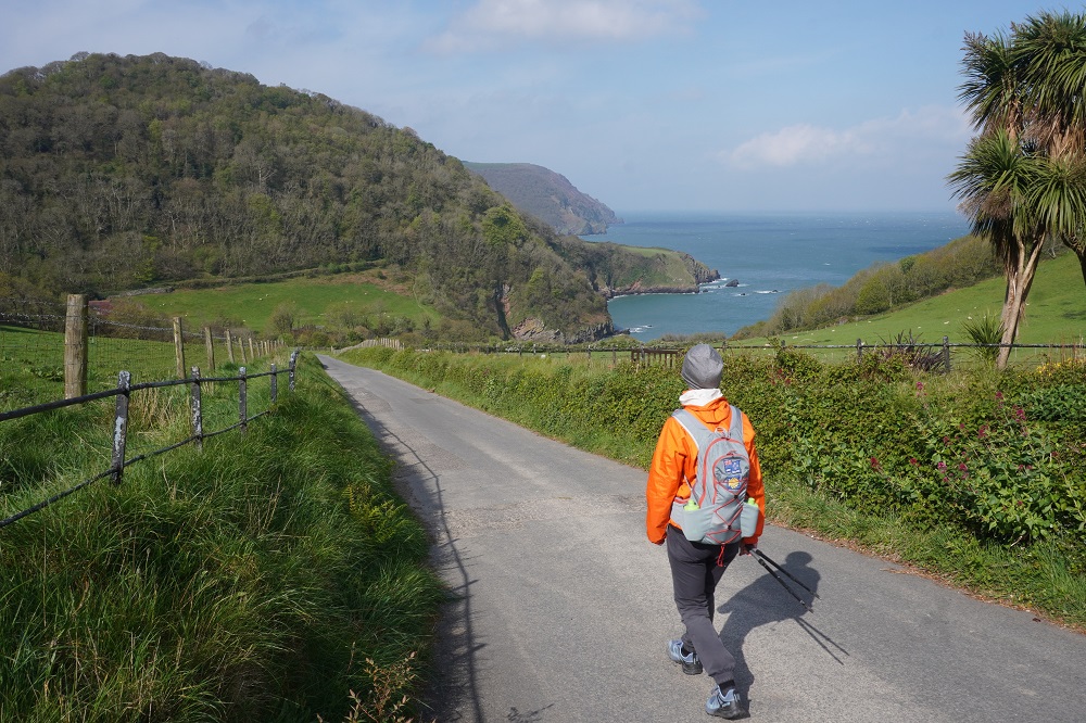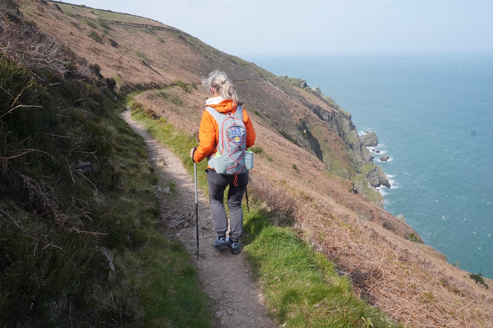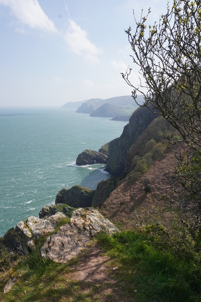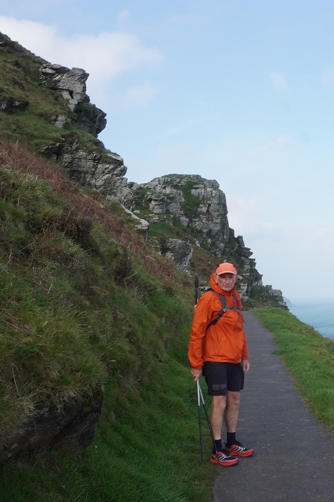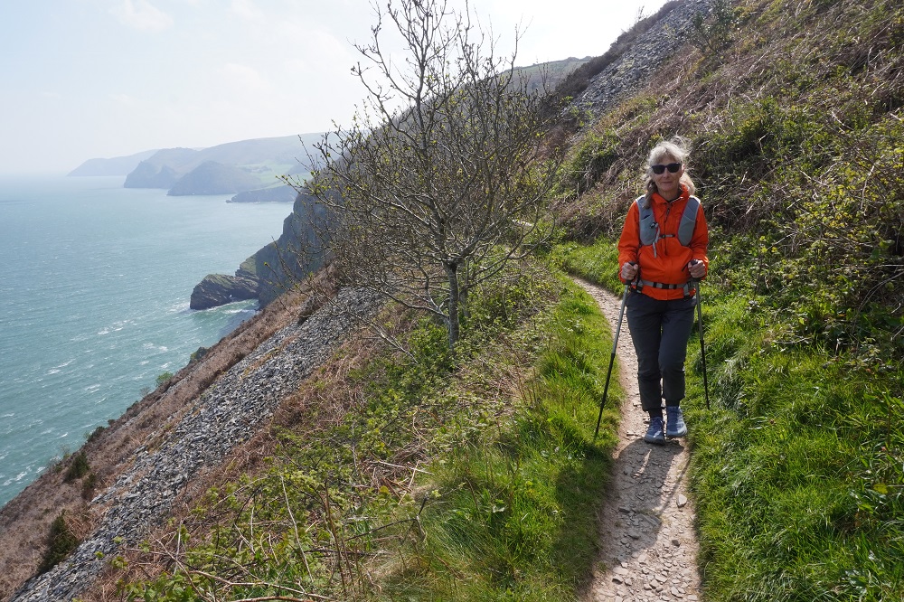 Today’s walk was also the most remote and isolated of the coast where Exmoor meets the sea. No villages, few farms, no harbours, no places to eat and drink – or loos. These are the parts of the walk we like the best. Barbara says it feels so wild and free. The cliffs, the rocks, the sea, the woodland, the sky, the wind, and the narrow path we faithfully follow.